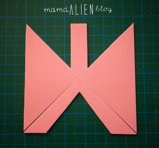 Agora, cole a lateral direita, levando as pontas até o centro, e com o auxílio da cola universal, cola para EVA, cola tudo ou pistola de cola quente, dependendo de sua preferência de cola para trabalhar com EVA.
